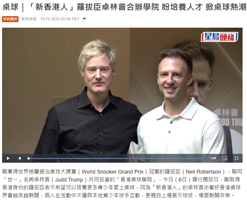 桌球|「新香港人」羅拔臣卓林普合辦學院 盼培養人才 掀桌球熱潮