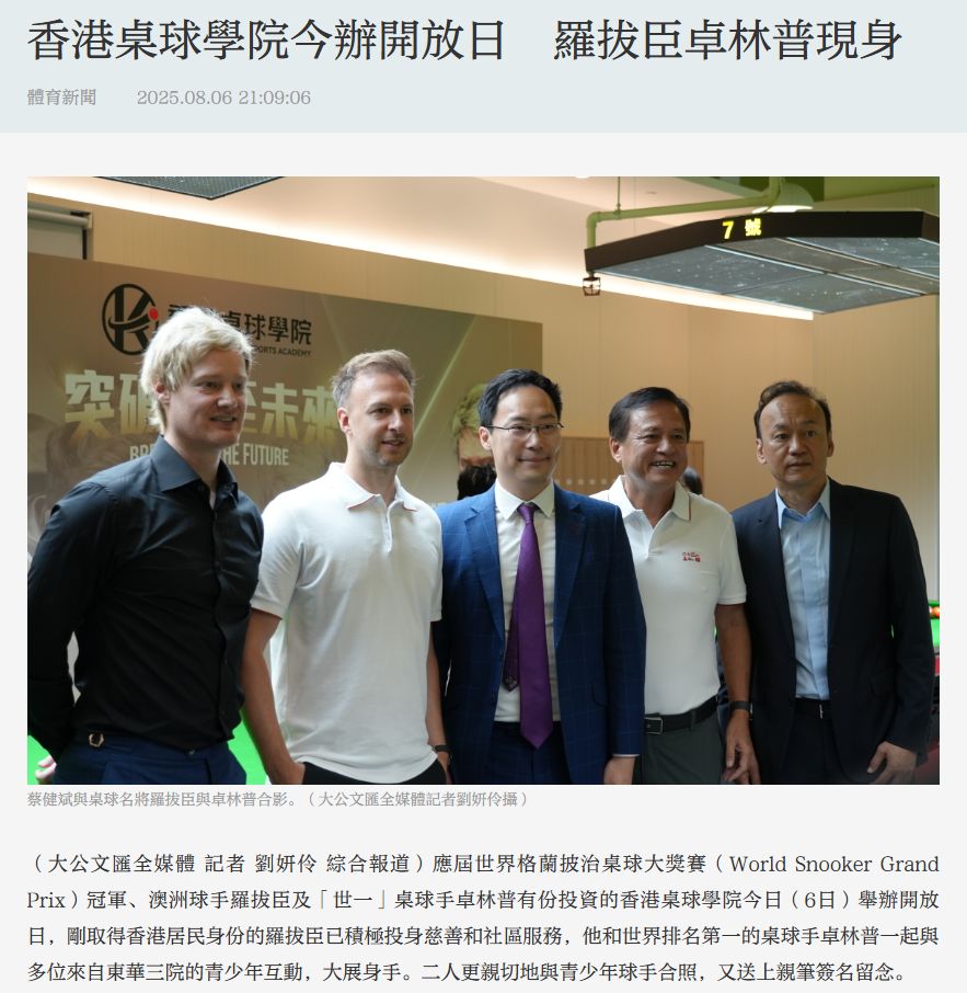 香港桌球學院今辦開放日 羅拔臣卓林普現身